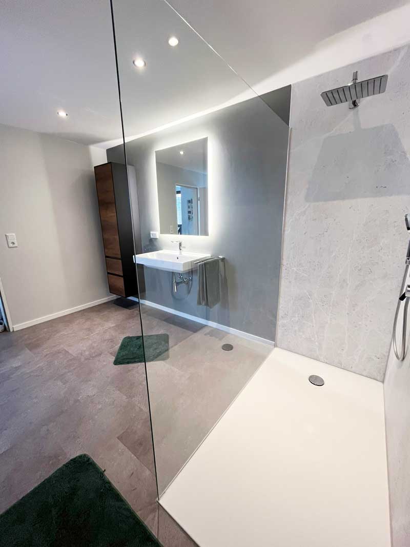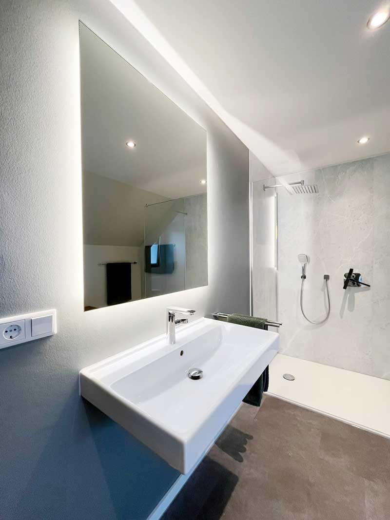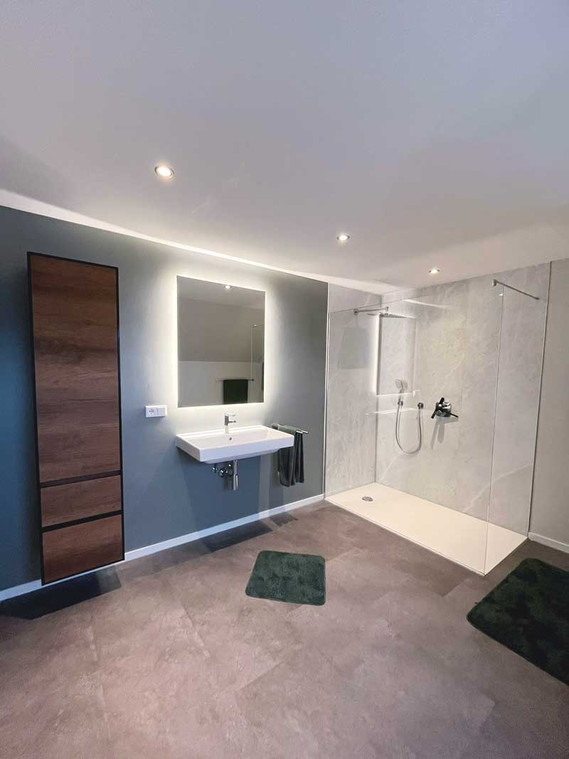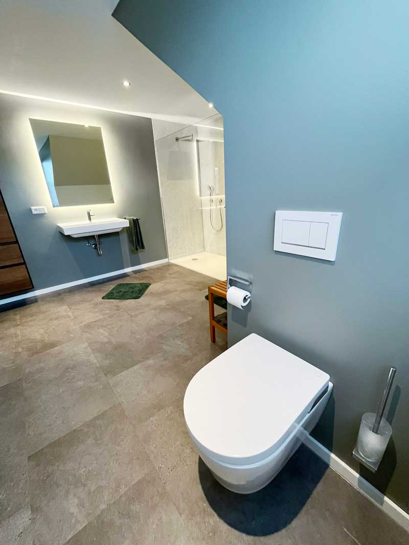 Dieses Badezimmer verbindet moderne Ästhetik mit funktionaler Barrierefreiheit. Der Verzicht auf einen Unterschrank unter dem Waschtisch war ein bewusster Kundenwunsch, um mehr Bewegungsfreiheit zu schaffen und den Raum luftiger wirken zu lassen. Die großzügige, bodengleiche Dusche sowie die klaren Linien und zurückhaltenden Farben unterstreichen den Anspruch an Komfort und Stil. Mit durchdachten Details wie wandintegrierten Armaturen, beleuchtetem Spiegel und einer harmonischen Raumaufteilung wurde ein Bad geschaffen, das Funktionalität und Wohnlichkeit ideal vereint.