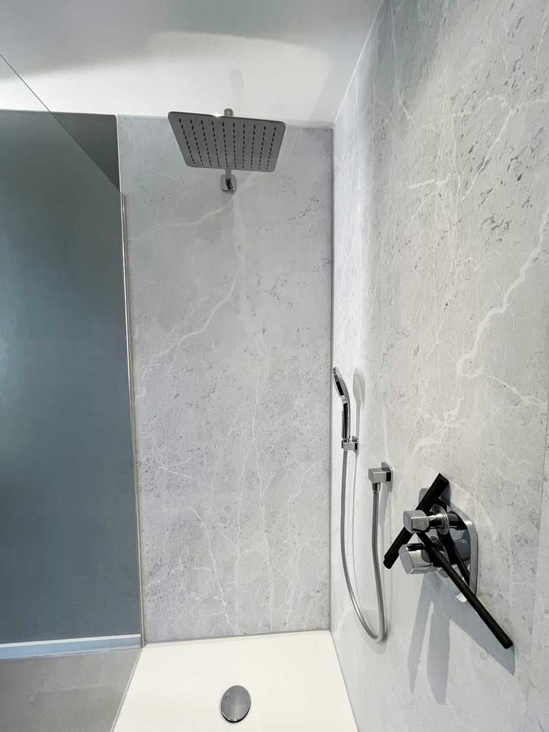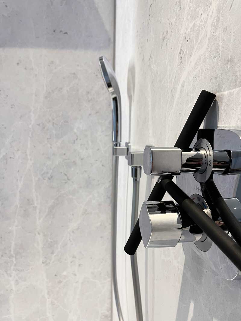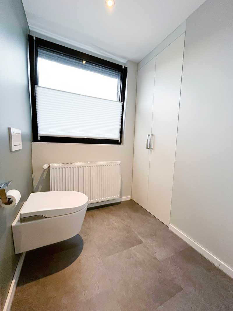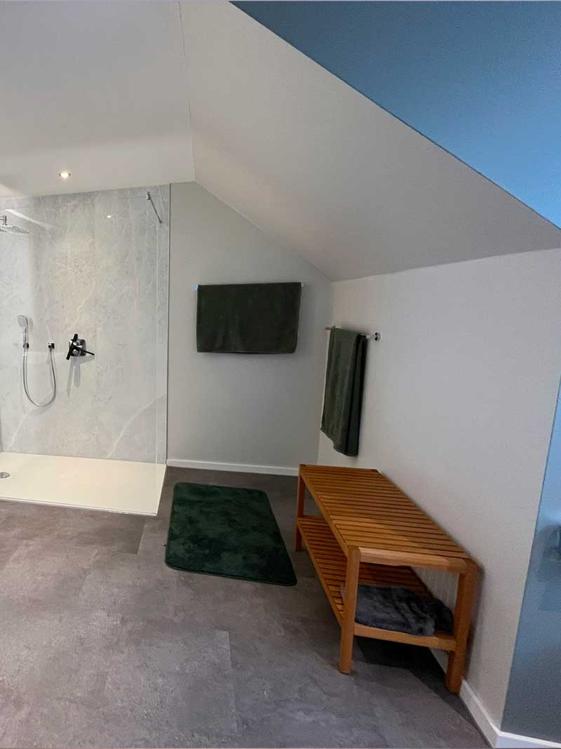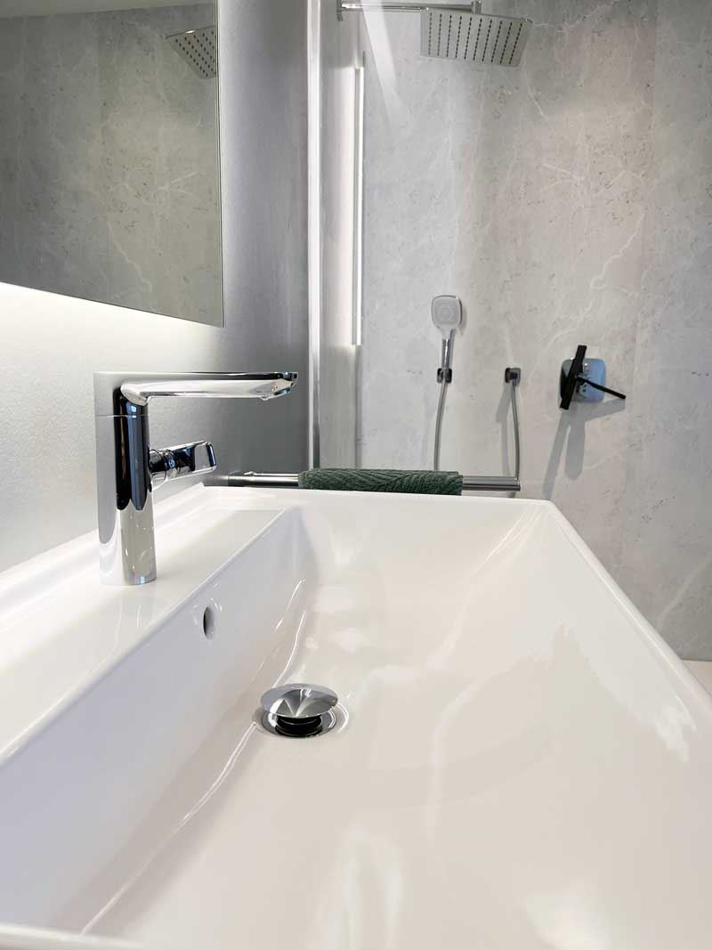Dieses Badezimmer verbindet moderne Ästhetik mit funktionaler Barrierefreiheit. Der Verzicht auf einen Unterschrank unter dem Waschtisch war ein bewusster Kundenwunsch, um mehr Bewegungsfreiheit zu schaffen und den Raum luftiger wirken zu lassen. Die großzügige, bodengleiche Dusche sowie die klaren Linien und zurückhaltenden Farben unterstreichen den Anspruch an Komfort und Stil. Mit durchdachten Details wie wandintegrierten Armaturen, beleuchtetem Spiegel und einer harmonischen Raumaufteilung wurde ein Bad geschaffen, das Funktionalität und Wohnlichkeit ideal vereint.