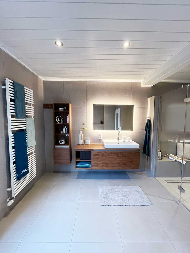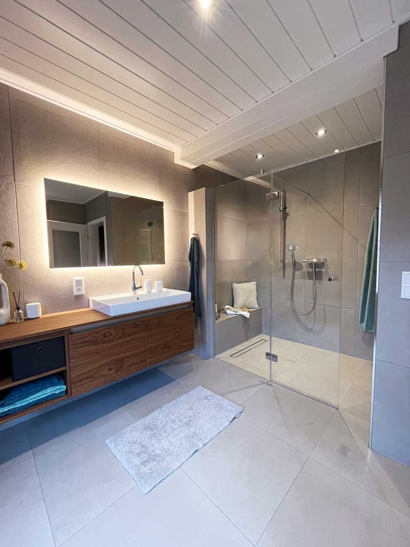 Ein modernes Bad mit klaren Linien, warmen Farben und viel Stauraum – abgestimmt auf die Bedürfnisse der Bauherren. Die große, bodengleiche Dusche bietet viel Bewegungsfreiheit und ist auch langfristig komfortabel nutzbar.