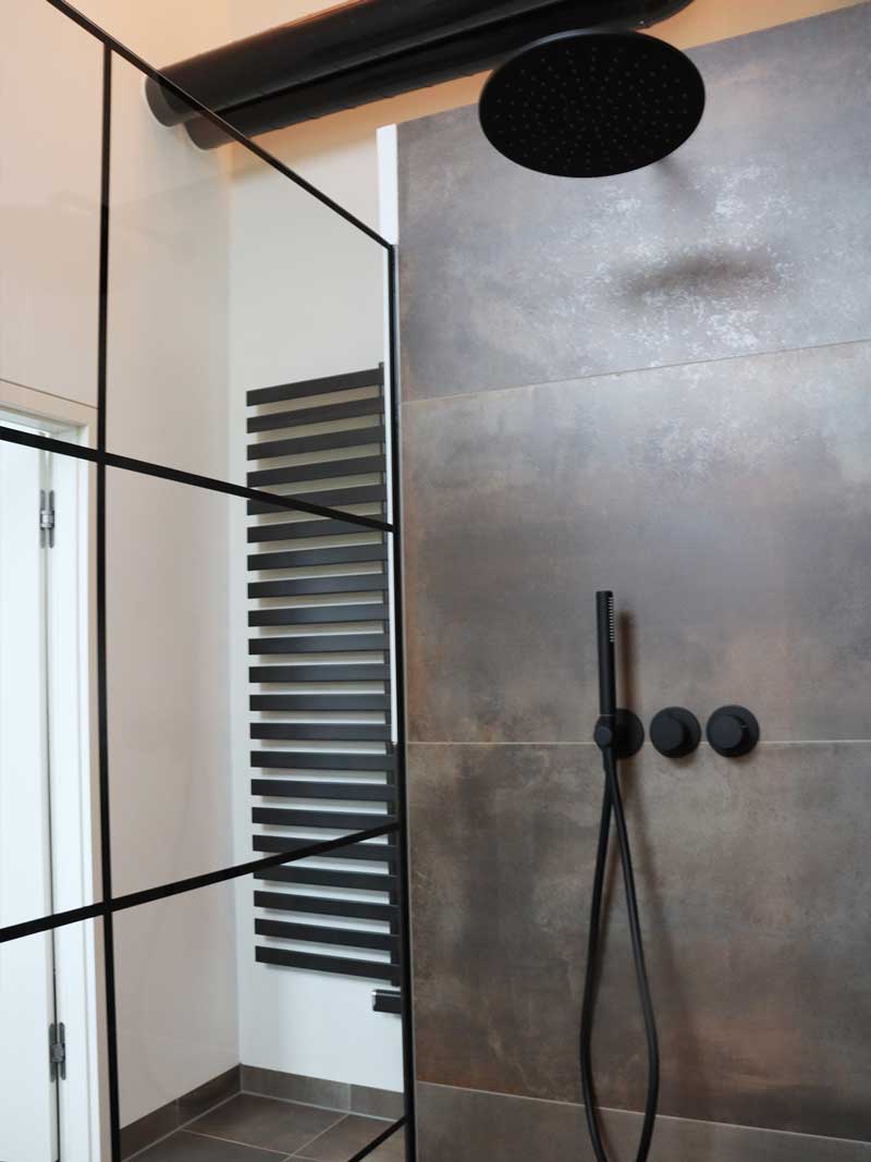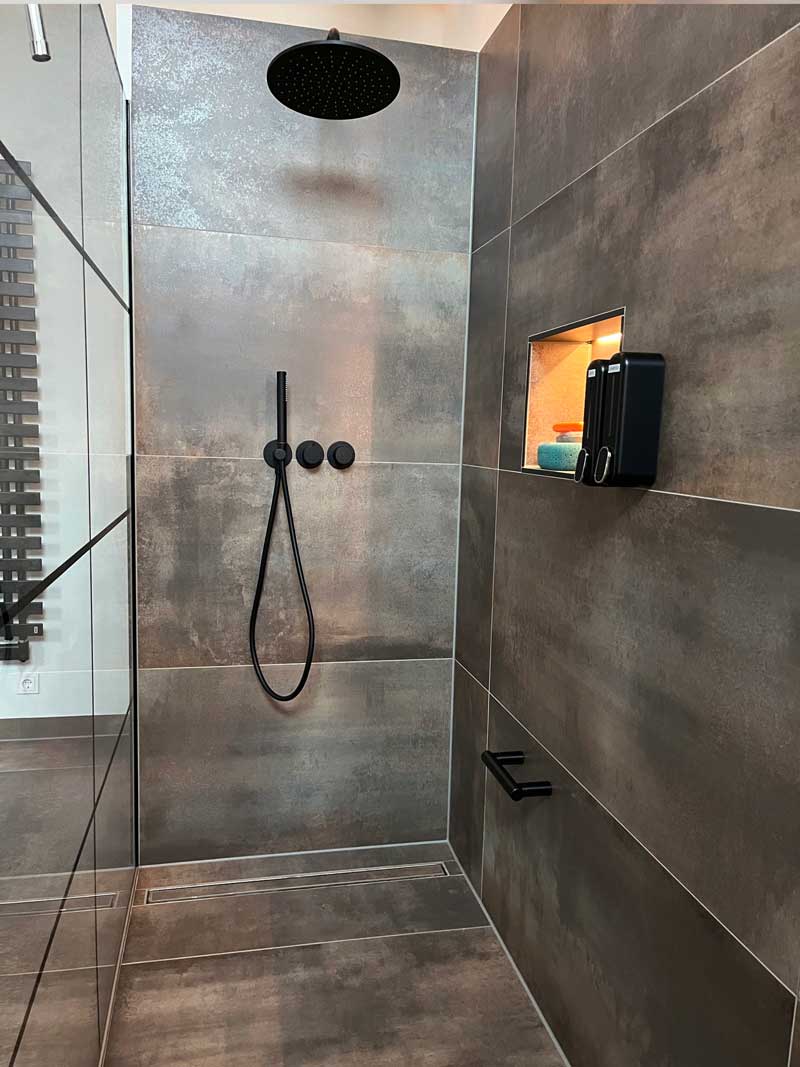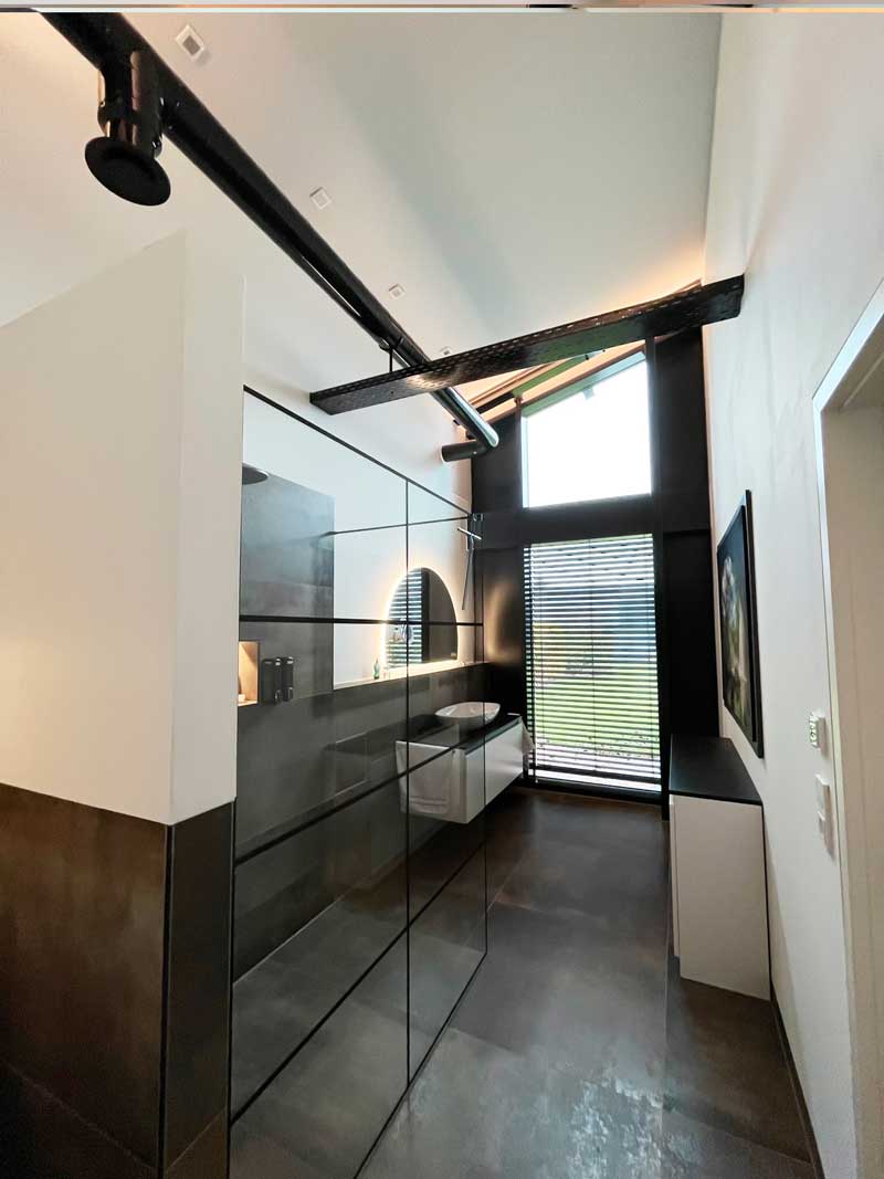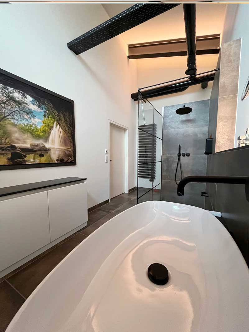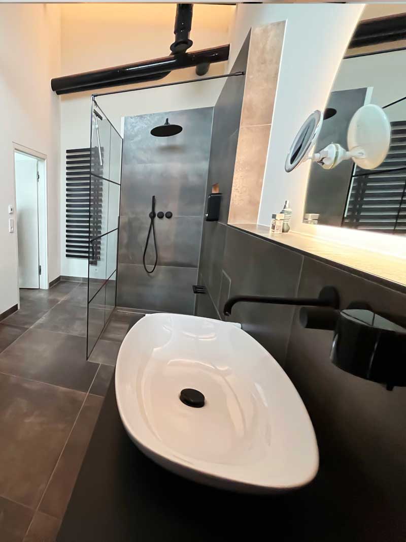 Dieses Badezimmer ist Teil eines durchdacht gestalteten Hauses im industriellen Loftstil. Klare Linien, dunkle Akzente und großzügige Raumwirkung prägen den Look. Das Paar, das hier lebt, hat großen Wert darauf gelegt, dass Ästhetik und Alltagstauglichkeit Hand in Hand gehen – auch mit Blick auf die Zukunft. Die barrierearme Dusche, durchdachte Raumaufteilung und hochwertige Materialien sorgen dafür, dass dieses Bad nicht nur heute, sondern auch im Alter ein Ort zum Wohlfühlen bleibt.