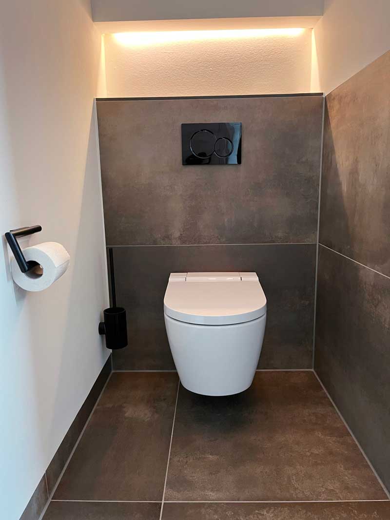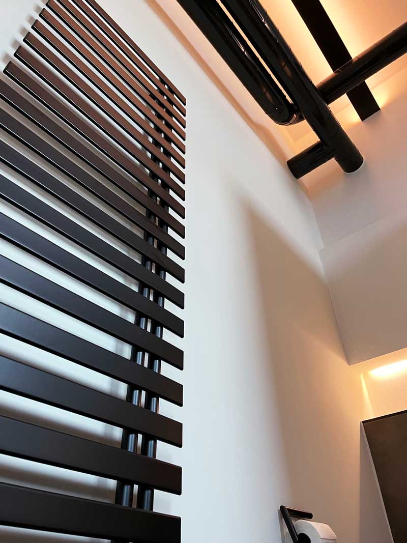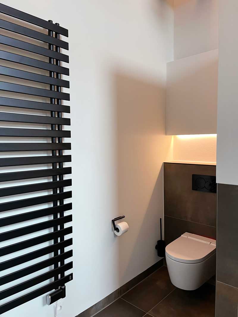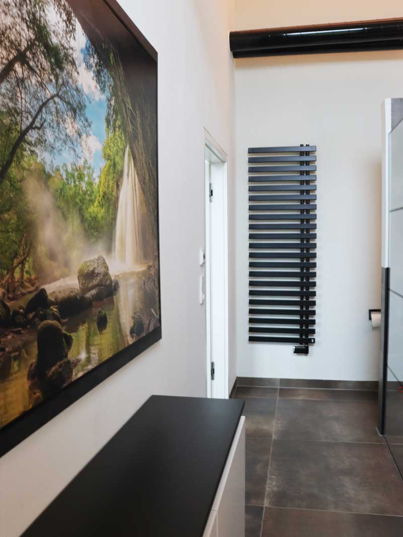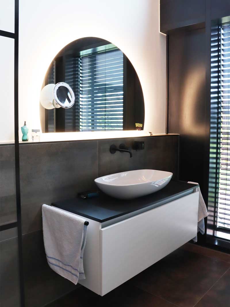 Dieses Badezimmer ist Teil eines durchdacht gestalteten Hauses im industriellen Loftstil. Klare Linien, dunkle Akzente und großzügige Raumwirkung prägen den Look. Das Paar, das hier lebt, hat großen Wert darauf gelegt, dass Ästhetik und Alltagstauglichkeit Hand in Hand gehen – auch mit Blick auf die Zukunft. Die barrierearme Dusche, durchdachte Raumaufteilung und hochwertige Materialien sorgen dafür, dass dieses Bad nicht nur heute, sondern auch im Alter ein Ort zum Wohlfühlen bleibt.