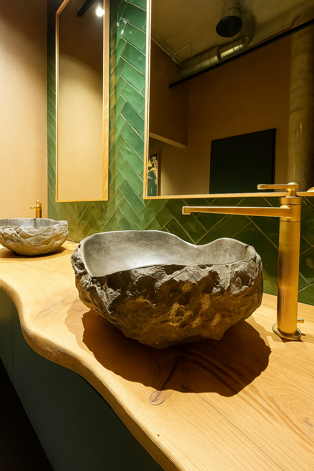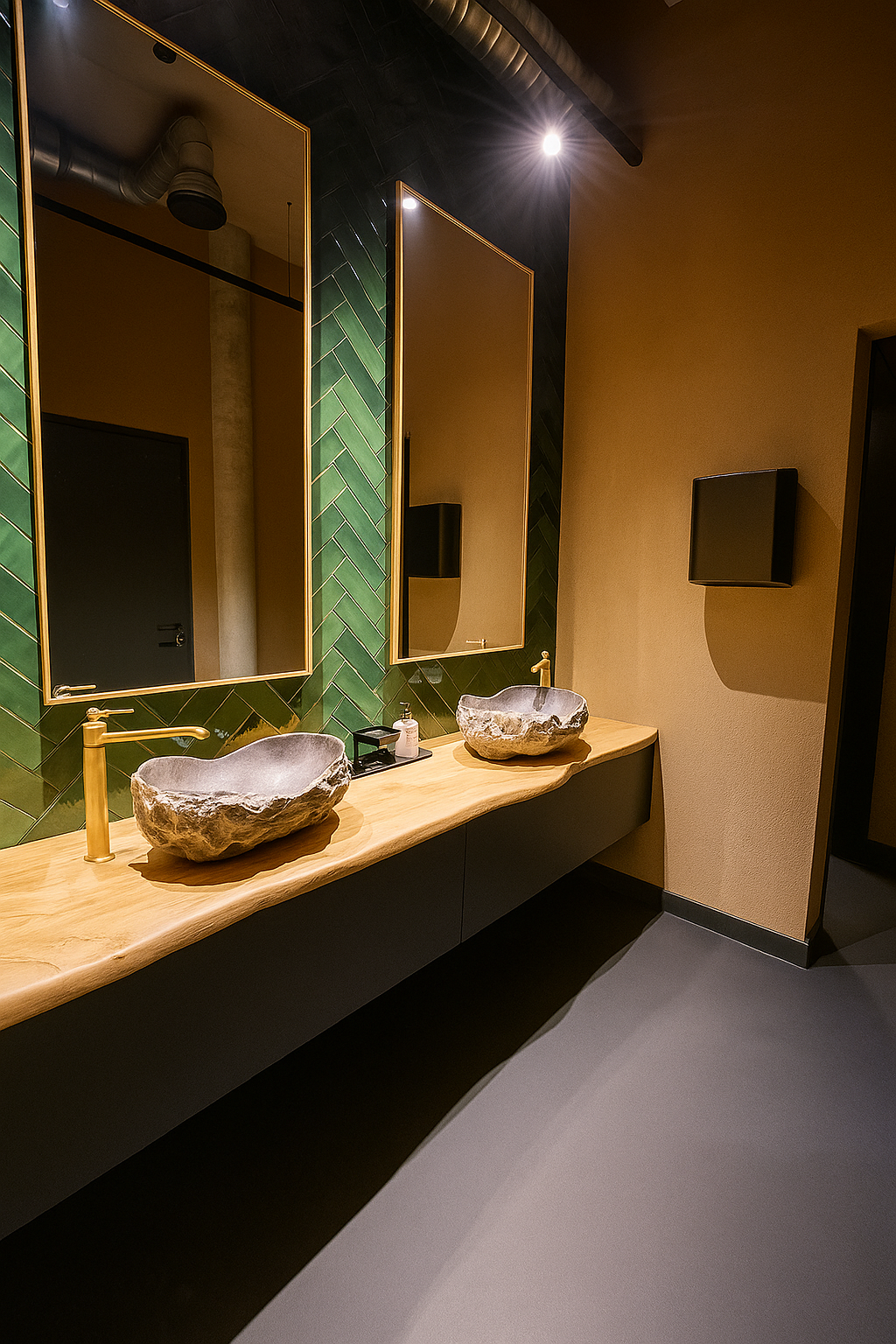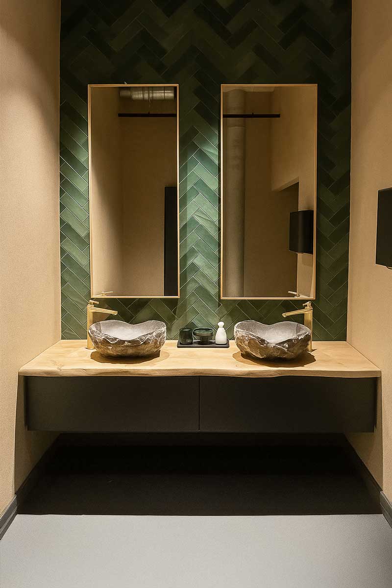 Mit viel Liebe zum Detail wurde hier ein harmonisches Zusammenspiel aus Design, Komfort und Hochwertigkeit geschaffen. Natursteinwaschbecken auf Massivholz, goldene Armaturen, warme Lichtakzente und kunstvolle Wandgestaltung mit floralen Elementen schaffen eine Atmosphäre, die einlädt, durchzuatmen. Die Kombination aus natürlichen Materialien und stilvoller Farbgebung – wie den tiefgrünen Fliesen im Fischgrätmuster – sorgt für eine moderne, gleichzeitig beruhigende Raumwirkung.