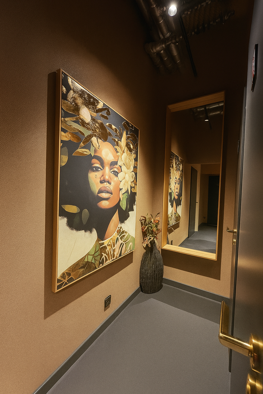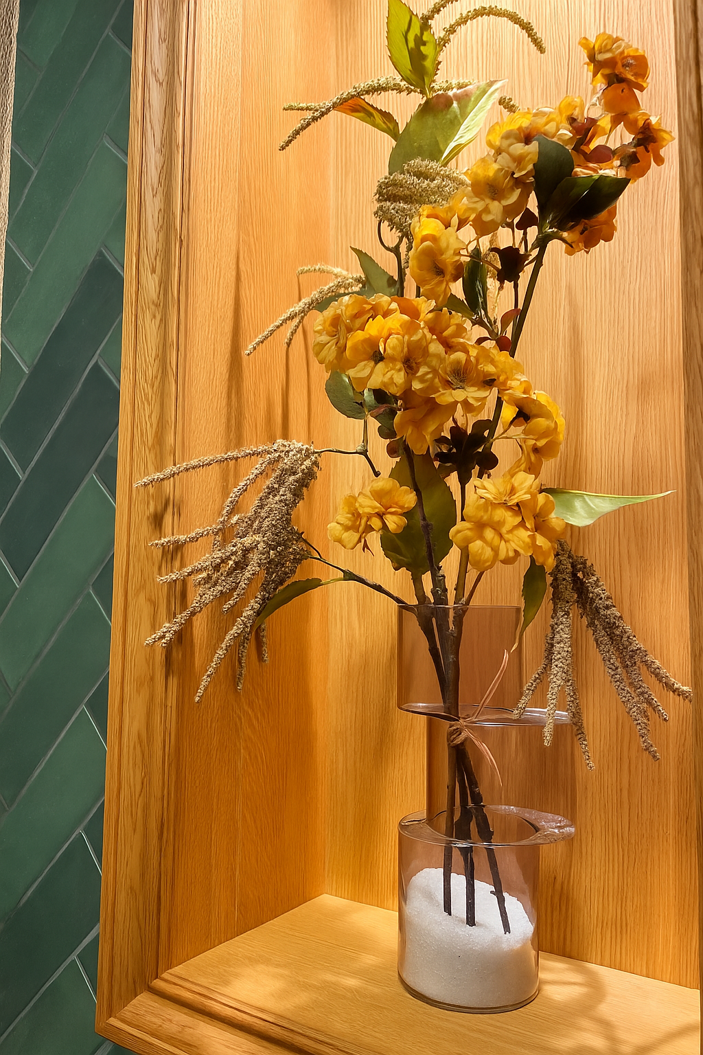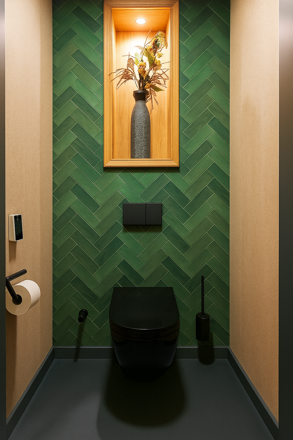 Mit viel Liebe zum Detail wurde hier ein harmonisches Zusammenspiel aus Design, Komfort und Hochwertigkeit geschaffen. Natursteinwaschbecken auf Massivholz, goldene Armaturen, warme Lichtakzente und kunstvolle Wandgestaltung mit floralen Elementen schaffen eine Atmosphäre, die einlädt, durchzuatmen. Die Kombination aus natürlichen Materialien und stilvoller Farbgebung – wie den tiefgrünen Fliesen im Fischgrätmuster – sorgt für eine moderne, gleichzeitig beruhigende Raumwirkung.