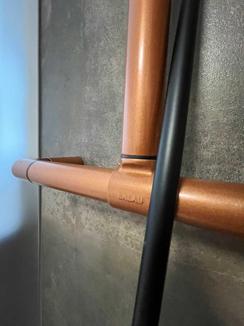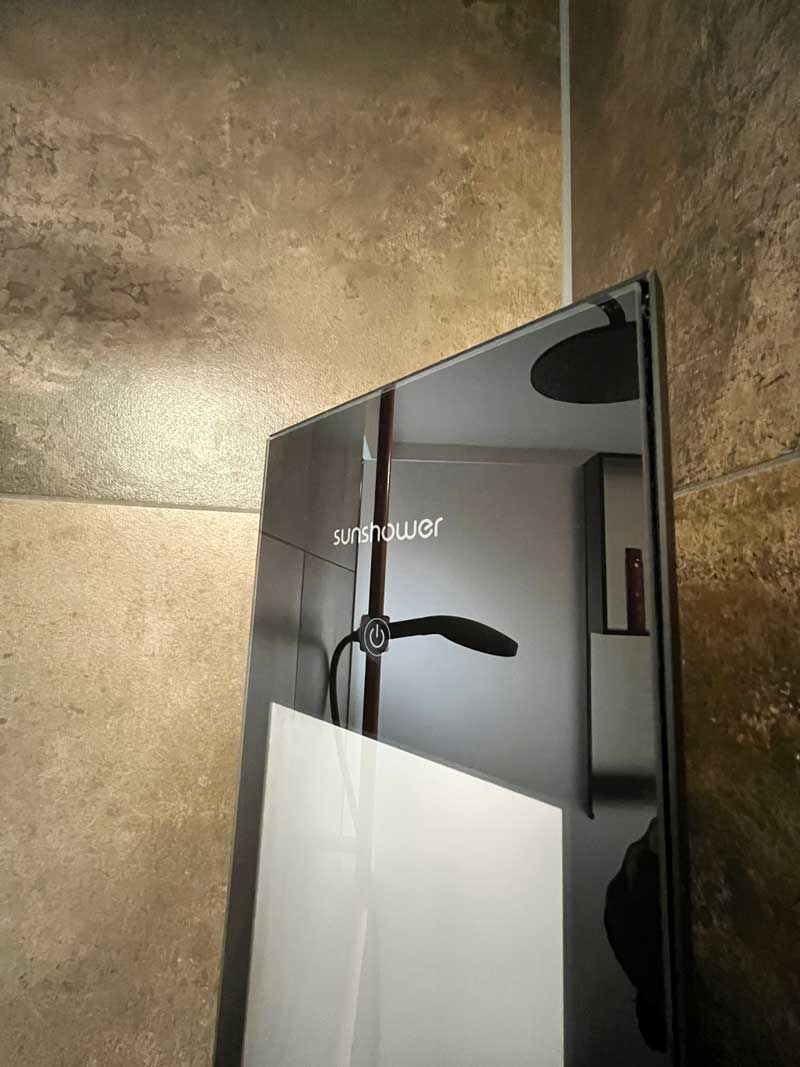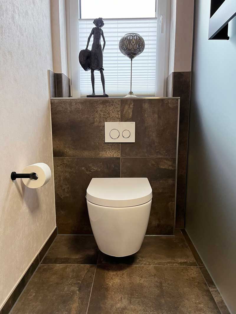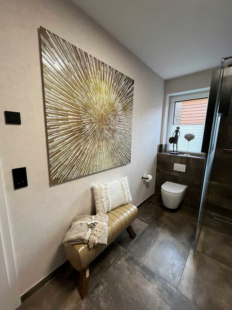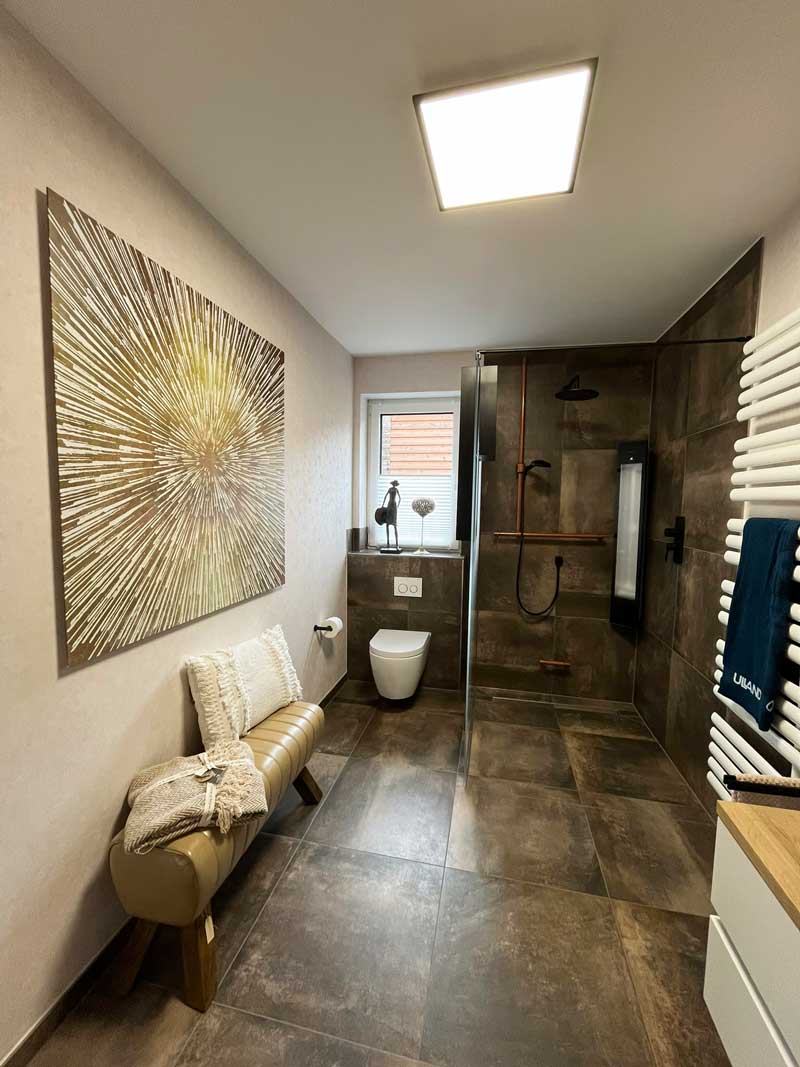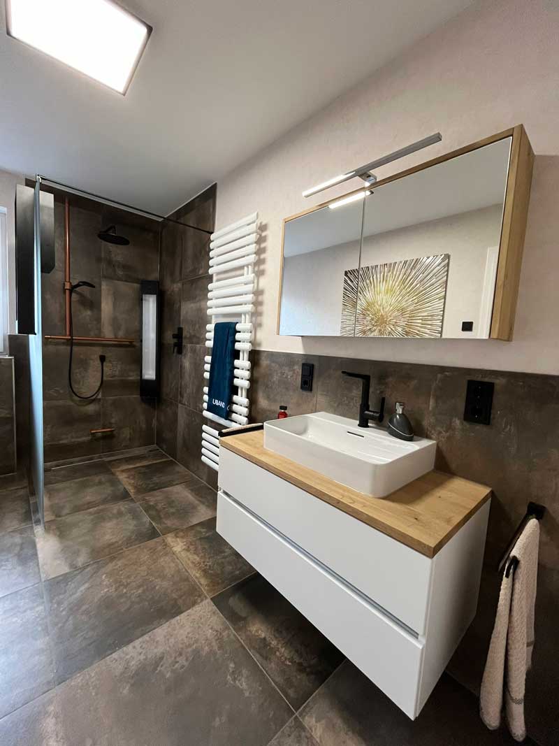 Dieses Badezimmerprojekt zeigt, wie harmonisch moderne Funktionalität und wohnliche Ästhetik miteinander verschmelzen können. Warme, strukturierte Fliesen bilden die Basis für ein stimmiges Raumkonzept. Der Duschbereich mit bodengleichem Einstieg, kupferfarbener Armatur und der integrierten Infrarot-„Sunshower“ bietet nicht nur Komfort, sondern auch wohltuende Wärme für Körper und Seele.
