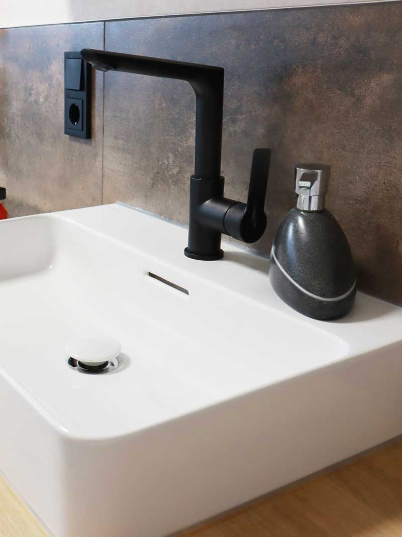 Der reduzierte Waschtisch mit heller Holzplatte und mattschwarzer Armatur setzt einen klaren Akzent und fügt sich dabei dezent in das Gesamtbild ein. Kleine Details – wie die dekorative Sitzbank, strukturierte Textilien und stilvolle Figuren – schaffen eine wohnliche Atmosphäre.