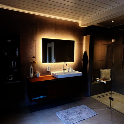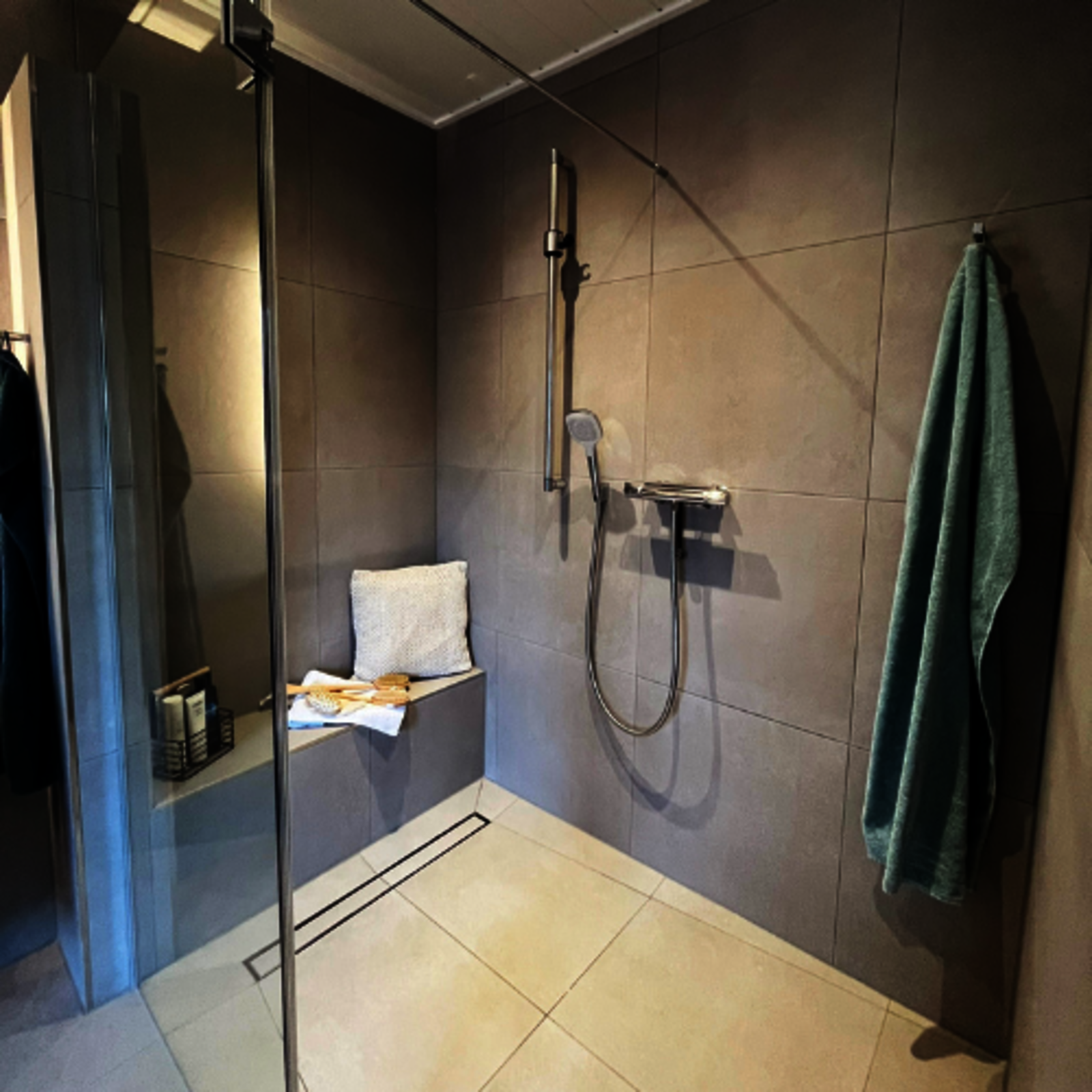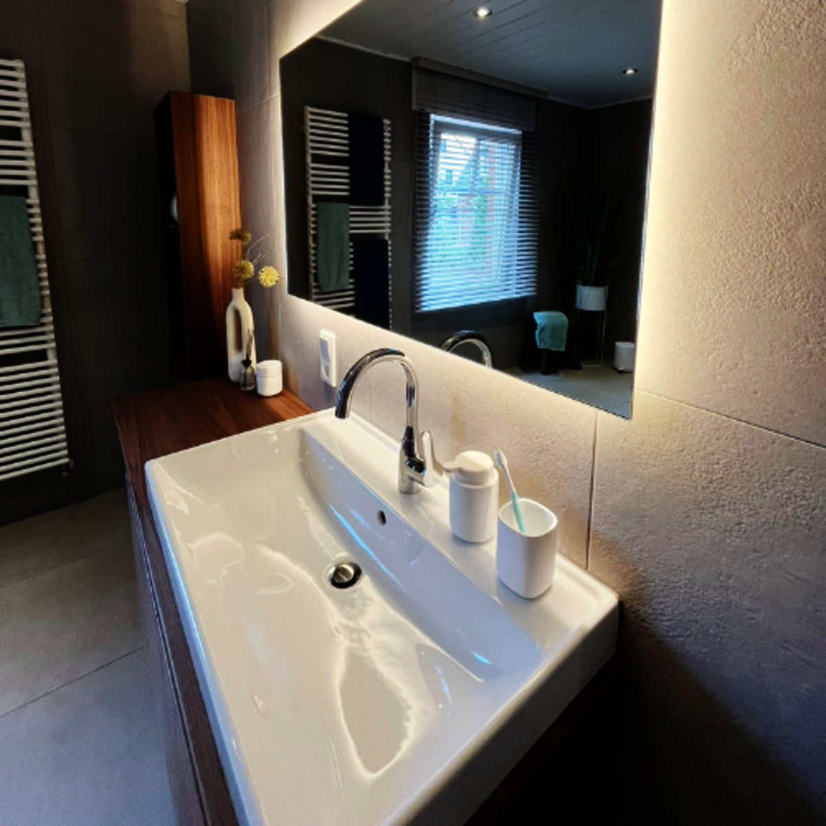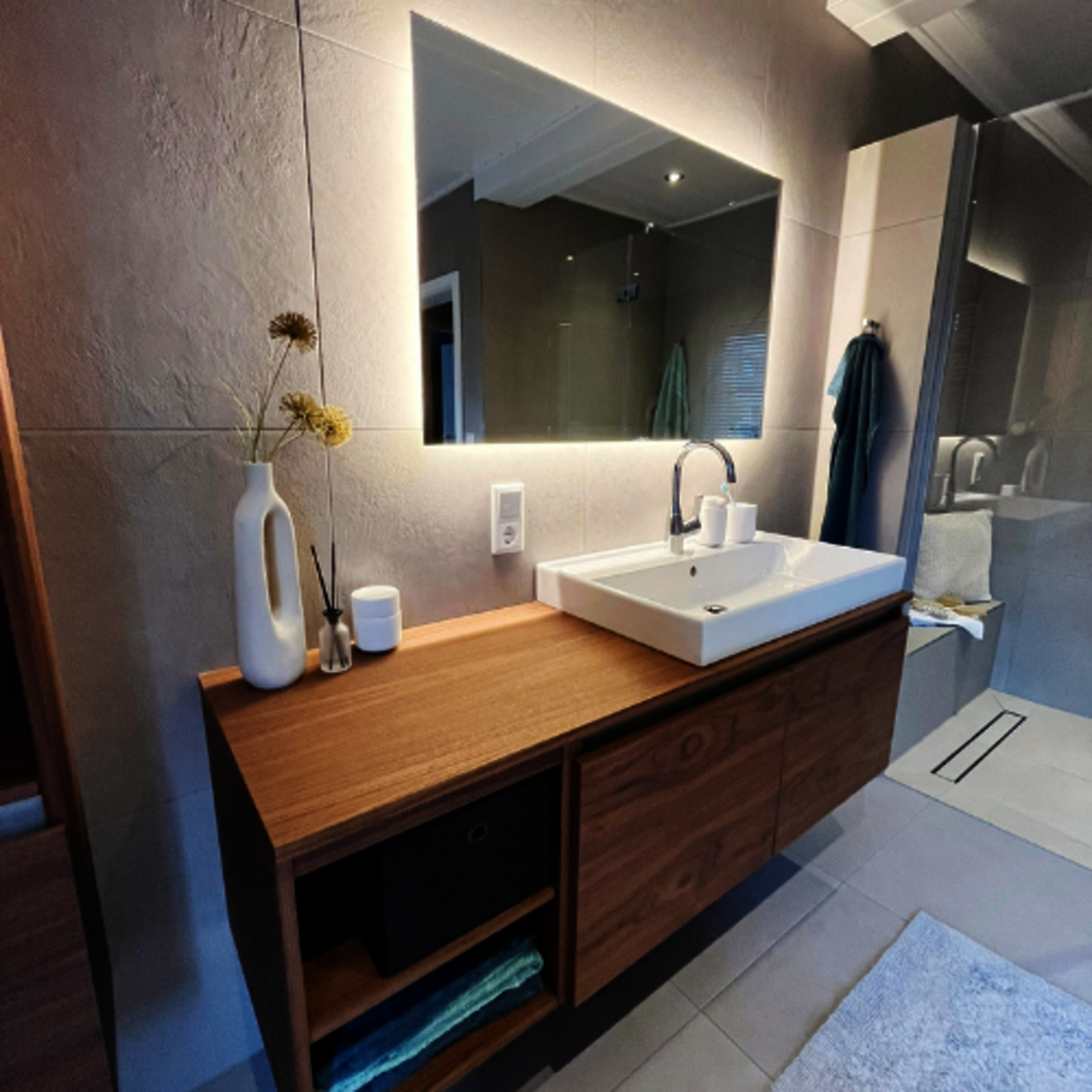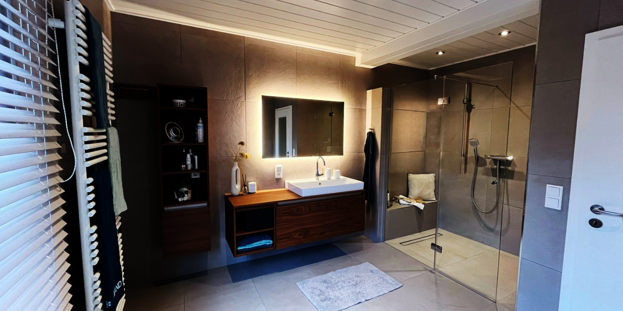 In diesem Badezimmer wurde viel Wert auf Geräumigkeit gelegt. Eine Badewanne war nicht mehr gewünscht, daher wurde eine große, geräumige und barrierefreie Dusche gewählt - perfekt für die Zukunft. Der Waschtisch mit indirekter Beleuchtung ist ein echter Blickfang, der die kühle Wirkung der Fliesen wunderbar ausgleicht und dem Raum eine warme Atmosphäre verleiht. Alles in allem ein wunderschönes und großzügiges Badezimmer, das zum Entspannen und Wohlfühlen einlädt.